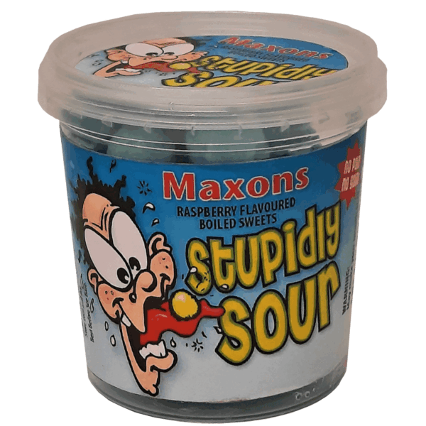 Maxon’s Stupidly Sour Raspberry Sweets Tub British 12x75g
