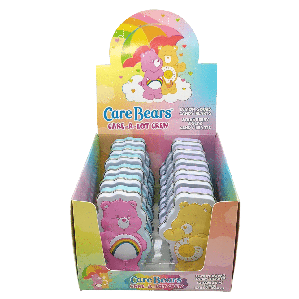 Fun shine and Cheer Care Bears make a happy team! Character tins are filled with 1.0 ounce of sour lemon and sour strawberry candy hearts.
