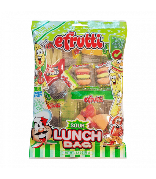 E.Frutti has created this sour version of the popular Gummi Lunch Bag for all of you sour lovers out there! This lunch tray includes mini, sour sanded, gummi versions of: Cola, Burgers, Corn on the Cob, Pizza, and Fries!