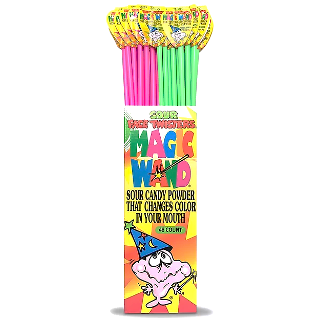 Magic Wand® Sour Powder Sidekick with Strawberry and Green Apple Flavors. Each 2 foot tall wand contains sour powder in each strawberry or green apple which changes color in your mouth.